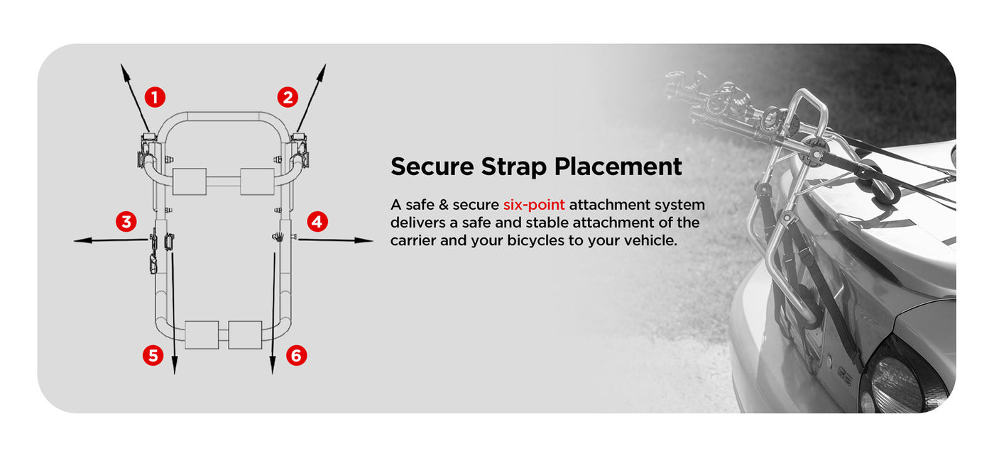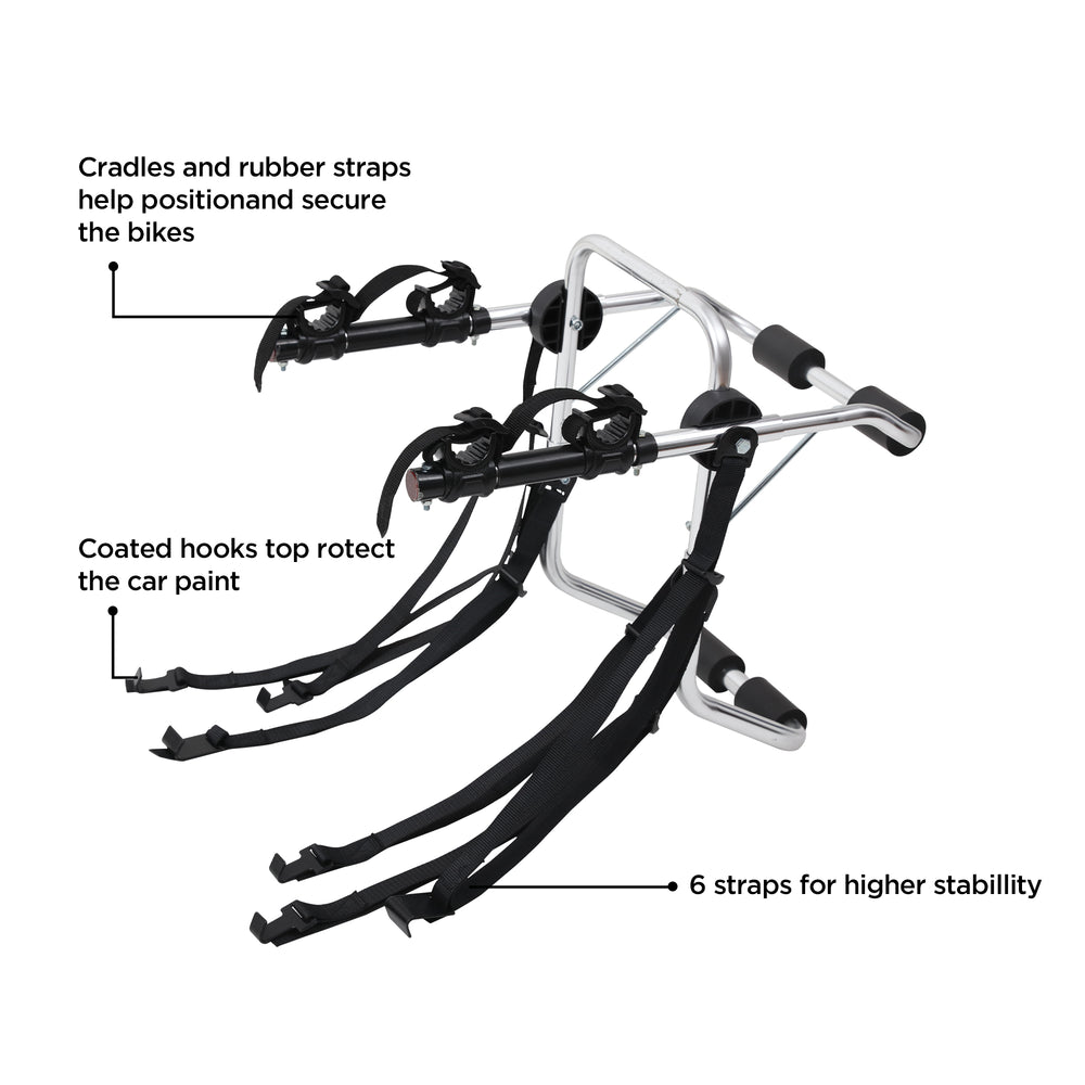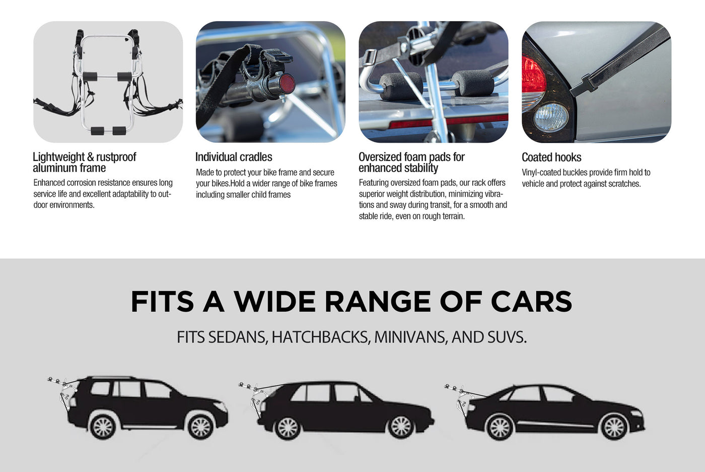 - UNIVERSAL FIT AND EASY INSTALLATION: The Trunk Mount 2-Bike Carrier fits most car models, including sedans, hatchbacks, and SUVs. Its adjustable straps and hooks ensure a secure and damage-free attachment, making installation quick and hassle-free.