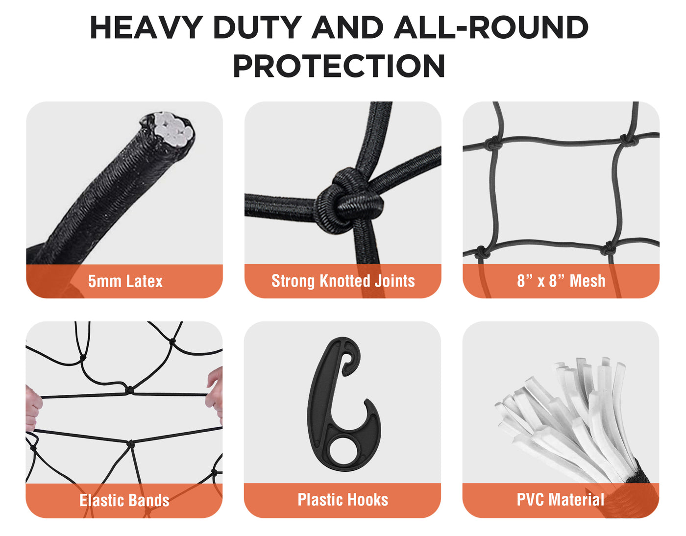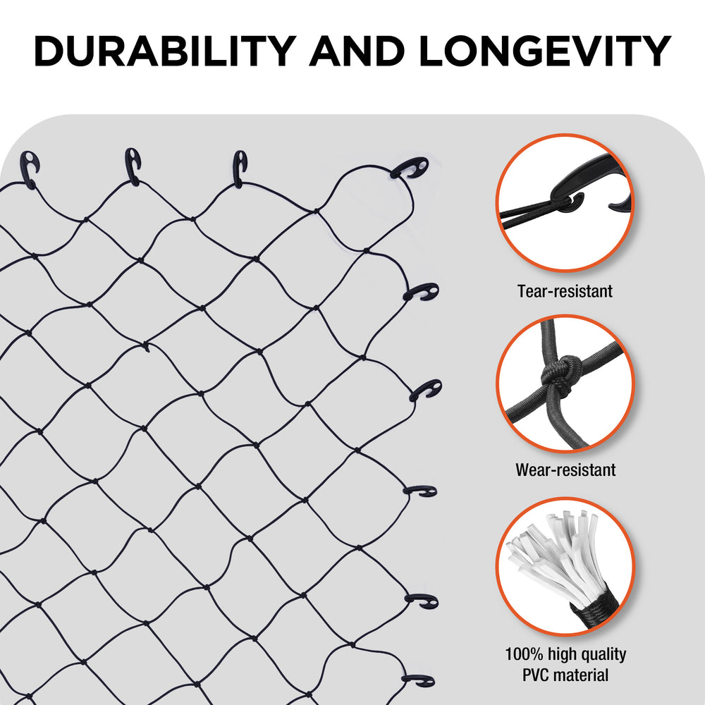- MAXIMUM SAFETY: Our Bungee Truck Net is designed with your safety in mind. Extreme caution is advised while stretching the cord, and protective eyewear is mandatory to avoid potential injuries. The sturdy hooks and robust cord are engineered to withstand force, ensuring your safety during use.