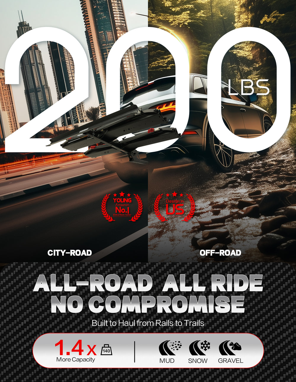 • 【All-Road Heavy-Duty Performance】 Engineered for both rugged trails and city streets with 200lbs capacity (industry-leading for e-bikes). Our reinforced steel-aluminum construction handles intense off-road conditions while maintaining sleek urban aesthetics. Tested stable at 70mph highway speeds.