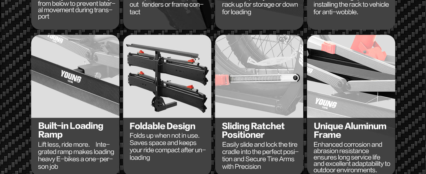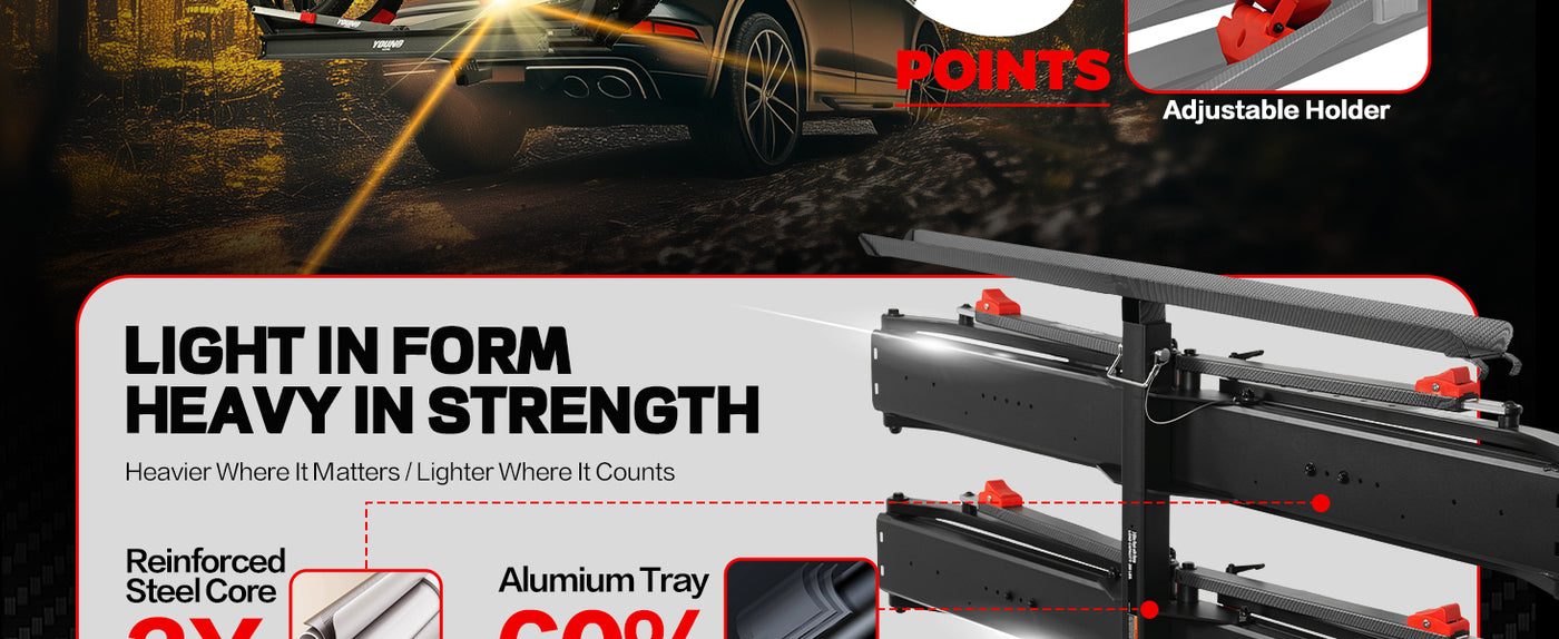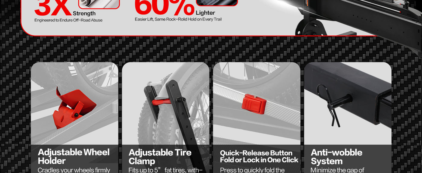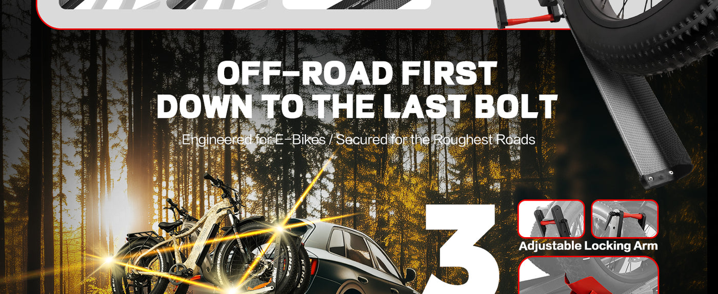 • 【Tri-Lock Stability System】Features three-point reinforced locking mechanism that outperforms standard two-point racks. The overbuilt Off-road first design with advanced anti-wobble technology keeps bikes secure even on bumpy terrain - "Locked by Three. Trusted Anywhere."