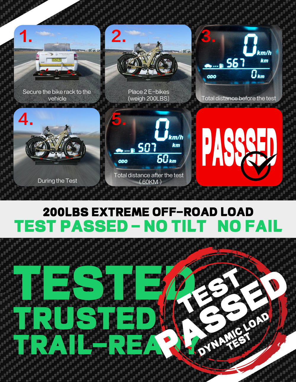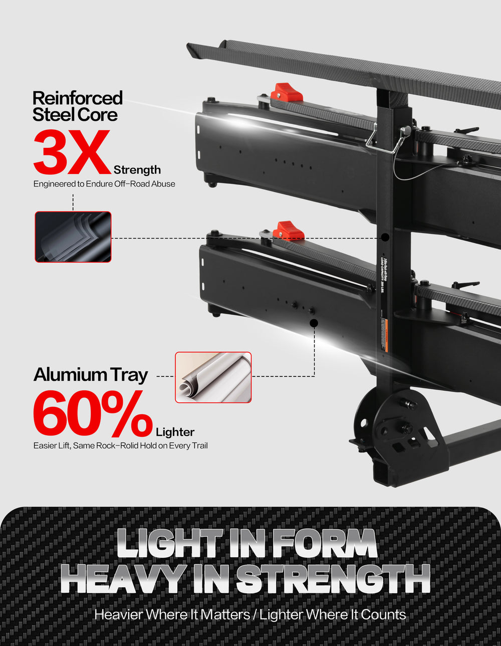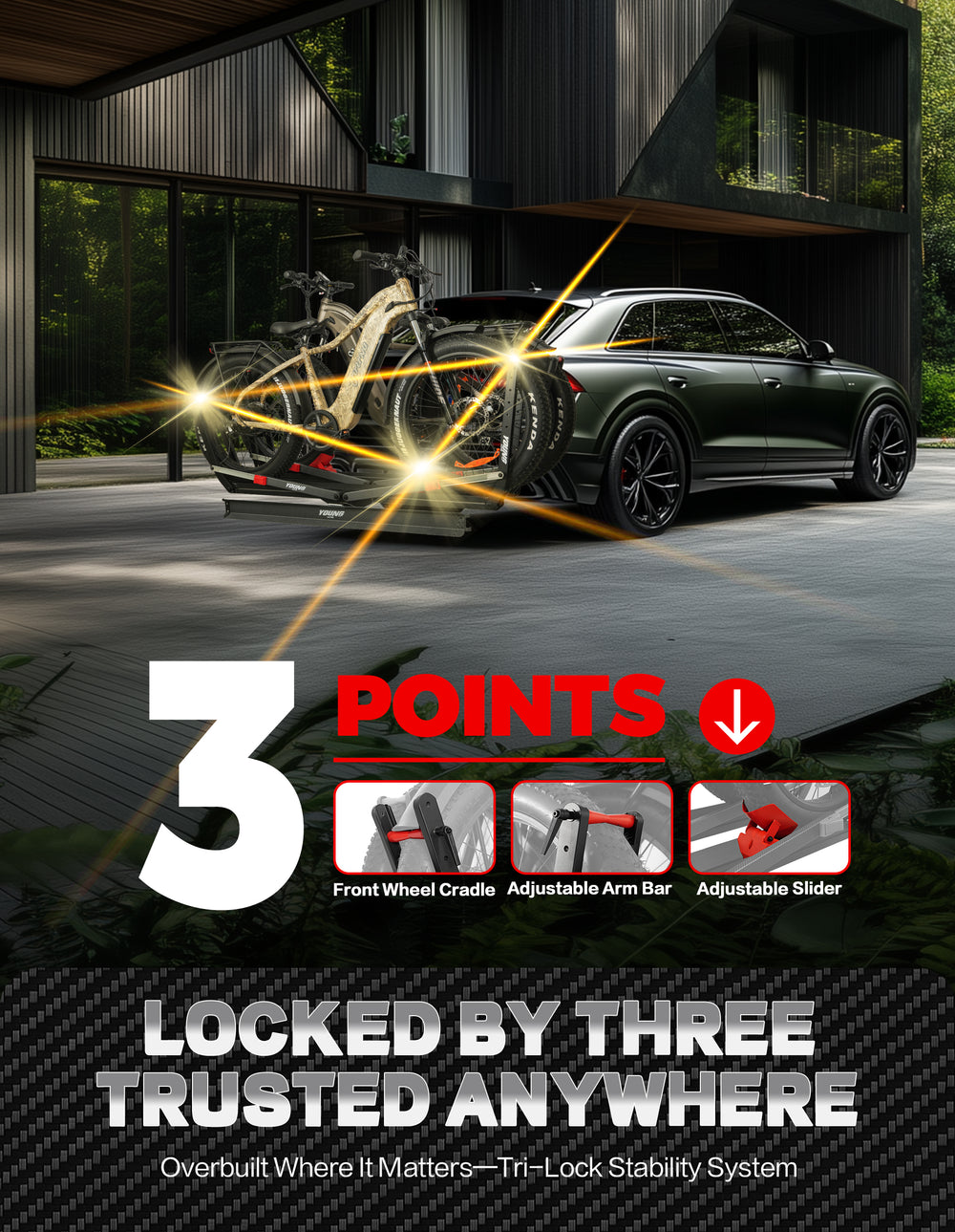 • 【Tri-Lock Stability System】Features three-point reinforced locking mechanism that outperforms standard two-point racks. The overbuilt Off-road first design with advanced anti-wobble technology keeps bikes secure even on bumpy terrain - "Locked by Three. Trusted Anywhere."