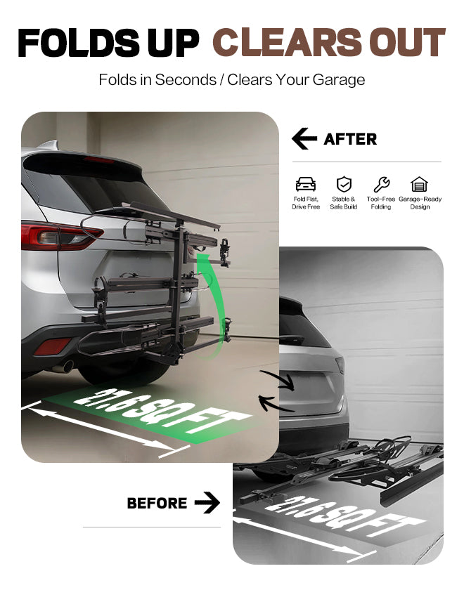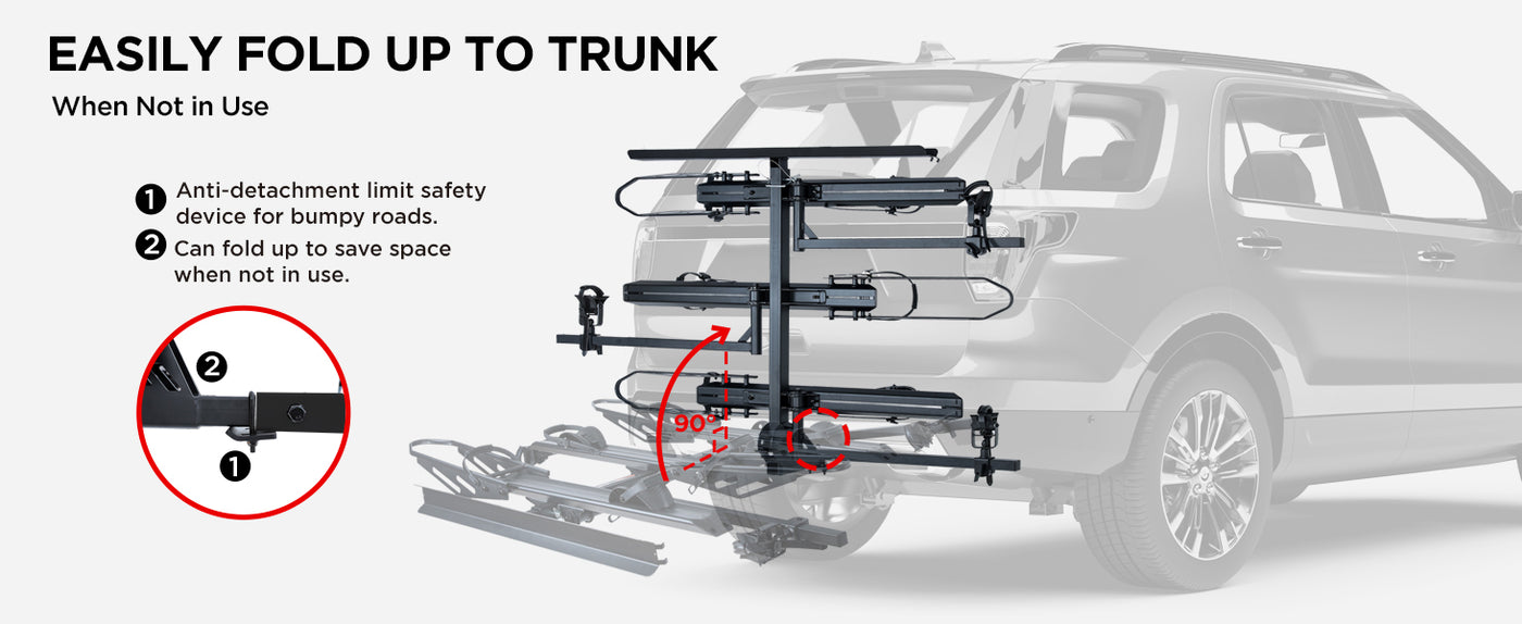 - FOLDABLE FOR SPACE-SAVING: The bike rack features a sturdy folding design that allows it to tilt 90 degrees towards the trunk, saving space and making it more compact when not in use.