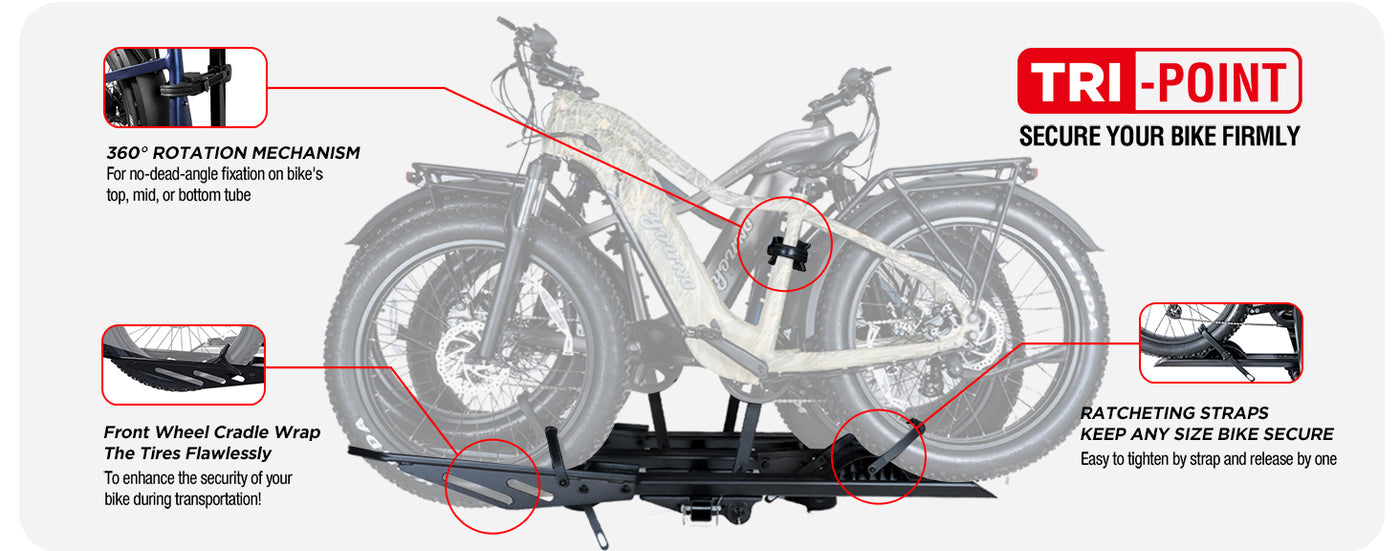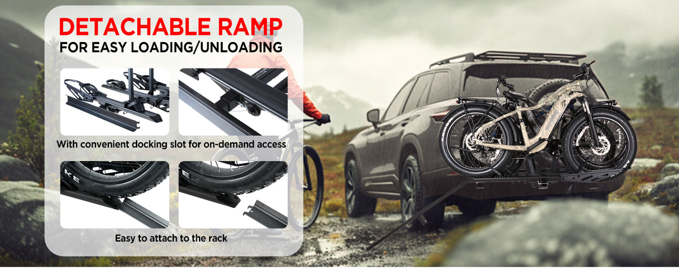 - EASY LOAD RAMP: This bike rack includes a convenient ramp, making loading and unloading heavy electric bikes effortless.