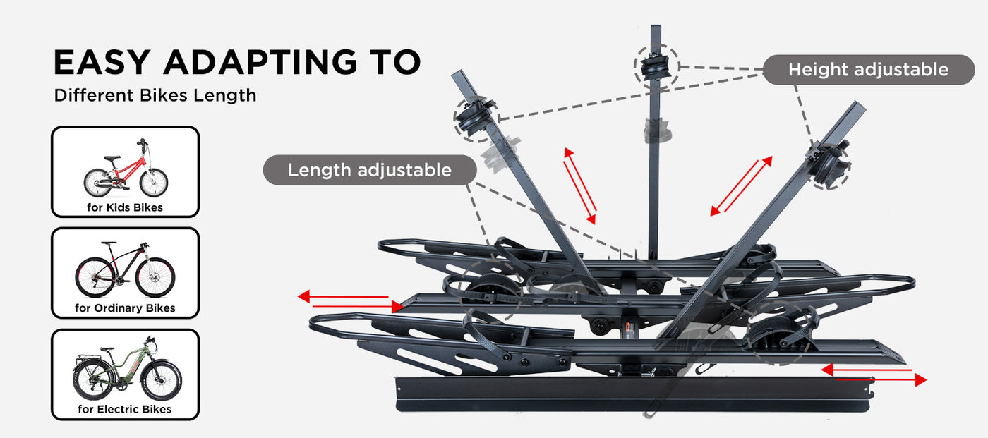 - DURABLE AND SAFE: This 3-bike Ebike rack is constructed with reinforced steel and aluminum, making it durable and powerful enough to carry 3 bikes or e-bikes. It features a 3-arm fix, patent-secure wheel cradles, and an anti-wobble structure to secure your e-bikes in place without swaying or knocking against the vehicle.