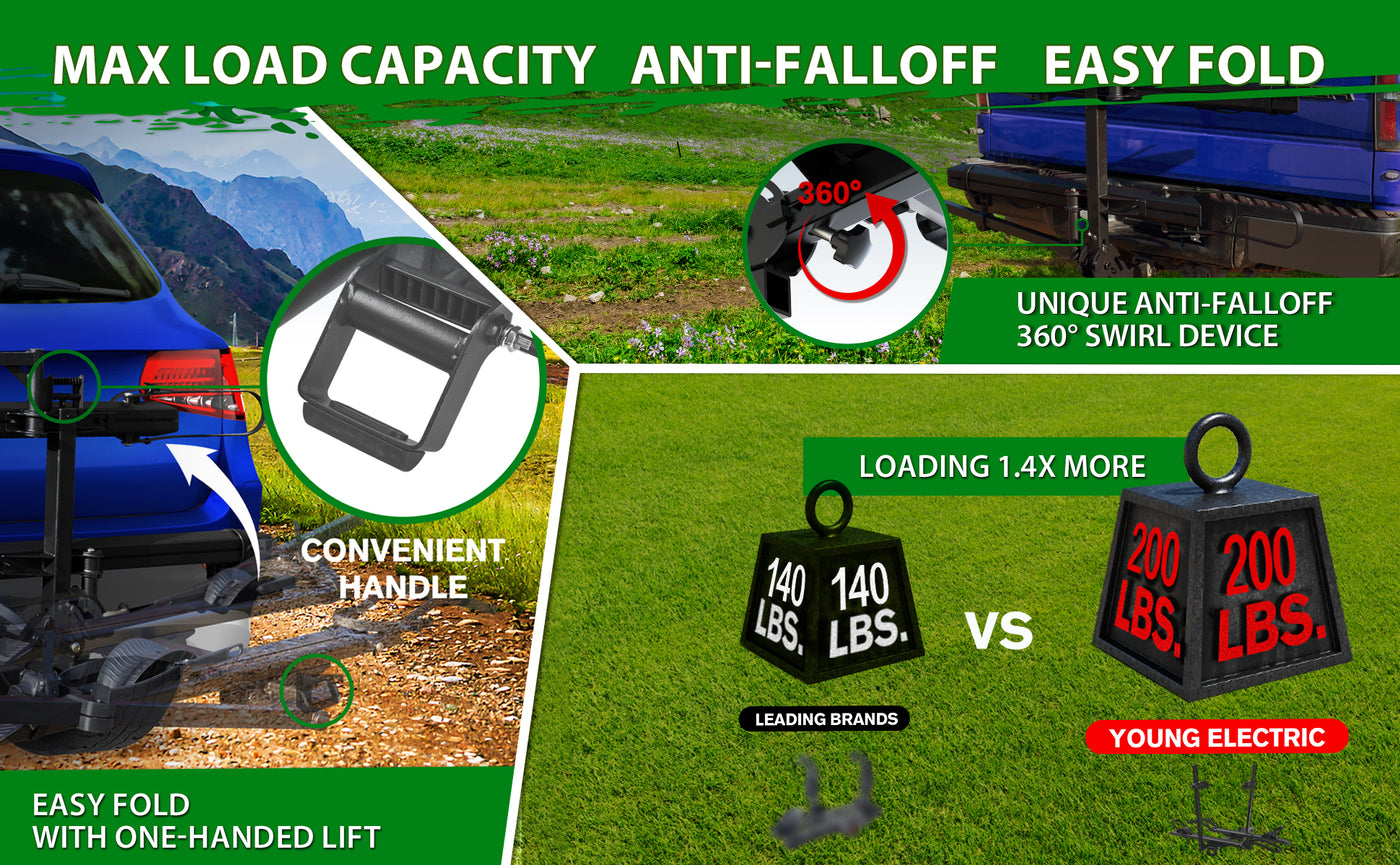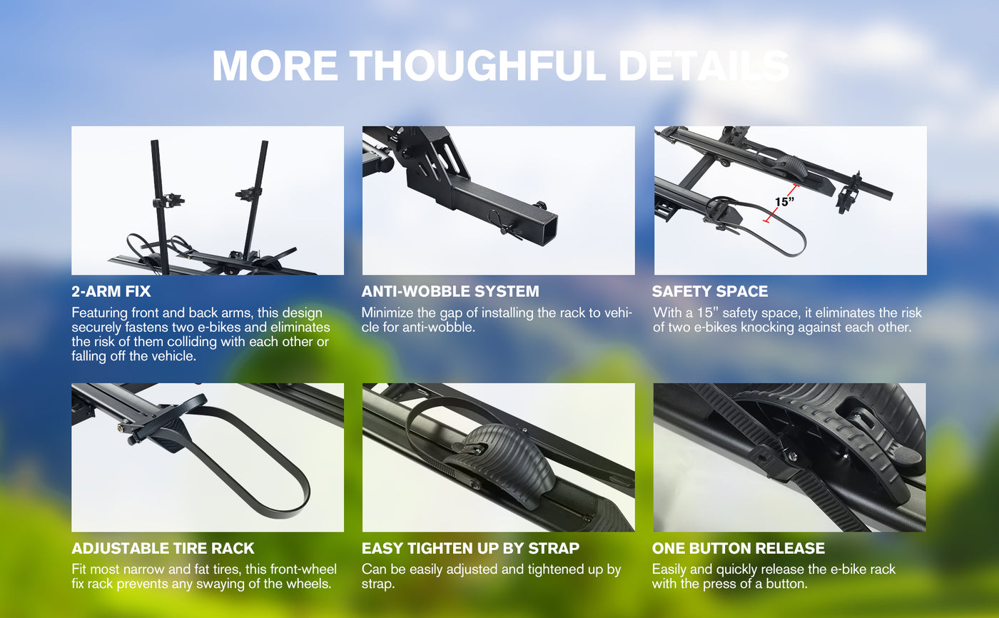 - SAFE AND SECURE ON OFFROAD: Comes with the 2-arm fix, Anti-falloff 360° swirl structure, and anti-wobble structure, that secures your E-bikes in place without swaying and knocking against the vehicle.