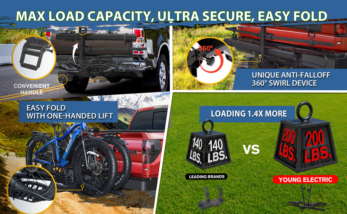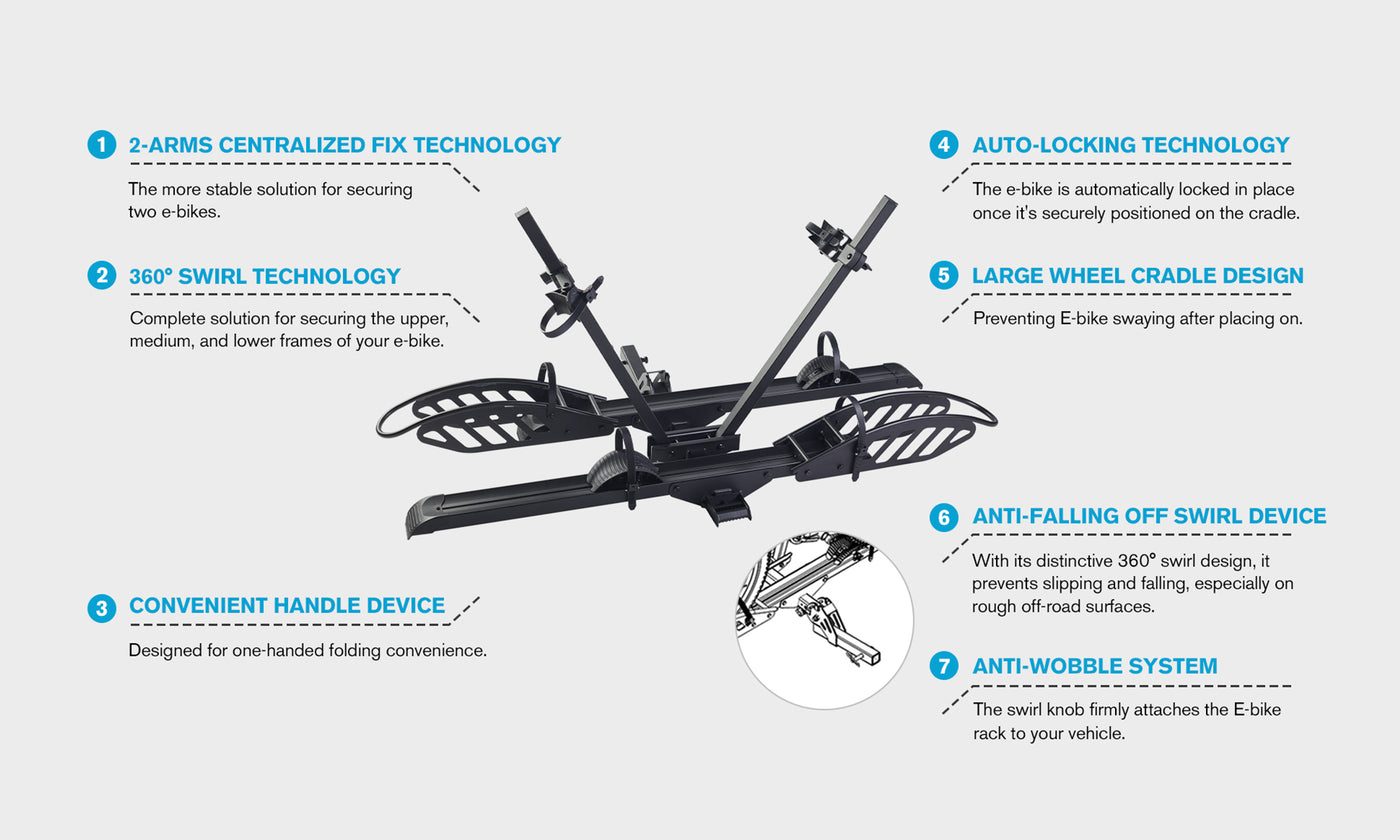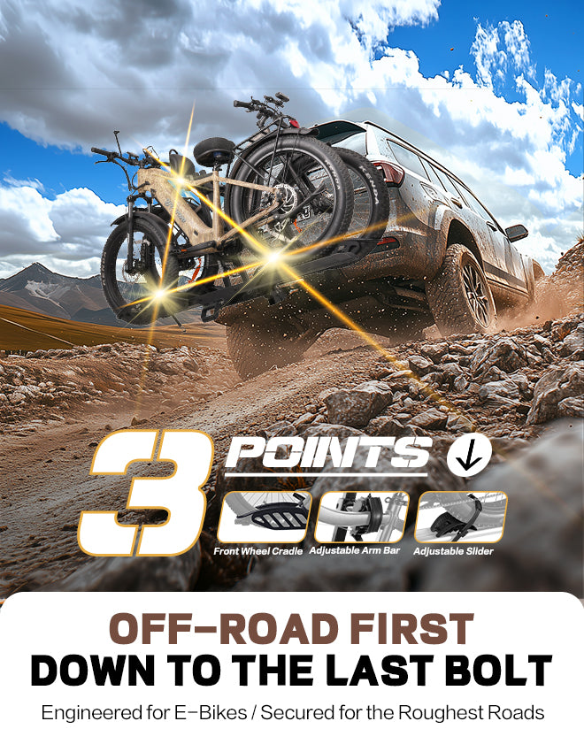 - SAFE AND SECURE OFFROAD: Features a dual-arm fix, anti-falloff 360° swivel design, patent secure wheel cradles, and an anti-wobble system to keep your e-bikes securely in place, preventing swaying or hitting the vehicle. Compatible with cars, SUVs, trucks, trailers, and RVs.