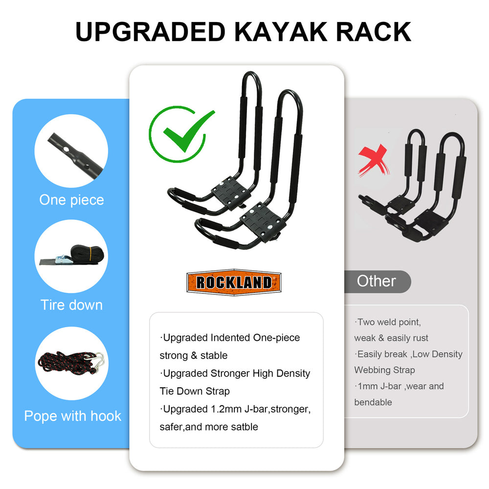 - SAFE AND SECURE HOLD: Our J-Rack Kayak Carrier is designed with your kayak’s safety in mind. It features robust tie-down straps and ropes with hooks, ensuring your kayak is securely fastened, even at speeds up to 80 mph. Enjoy peace of mind knowing your kayak will stay put during your travels.