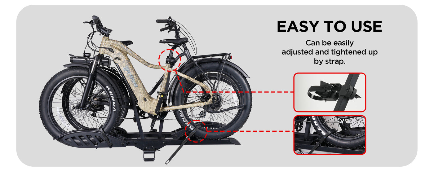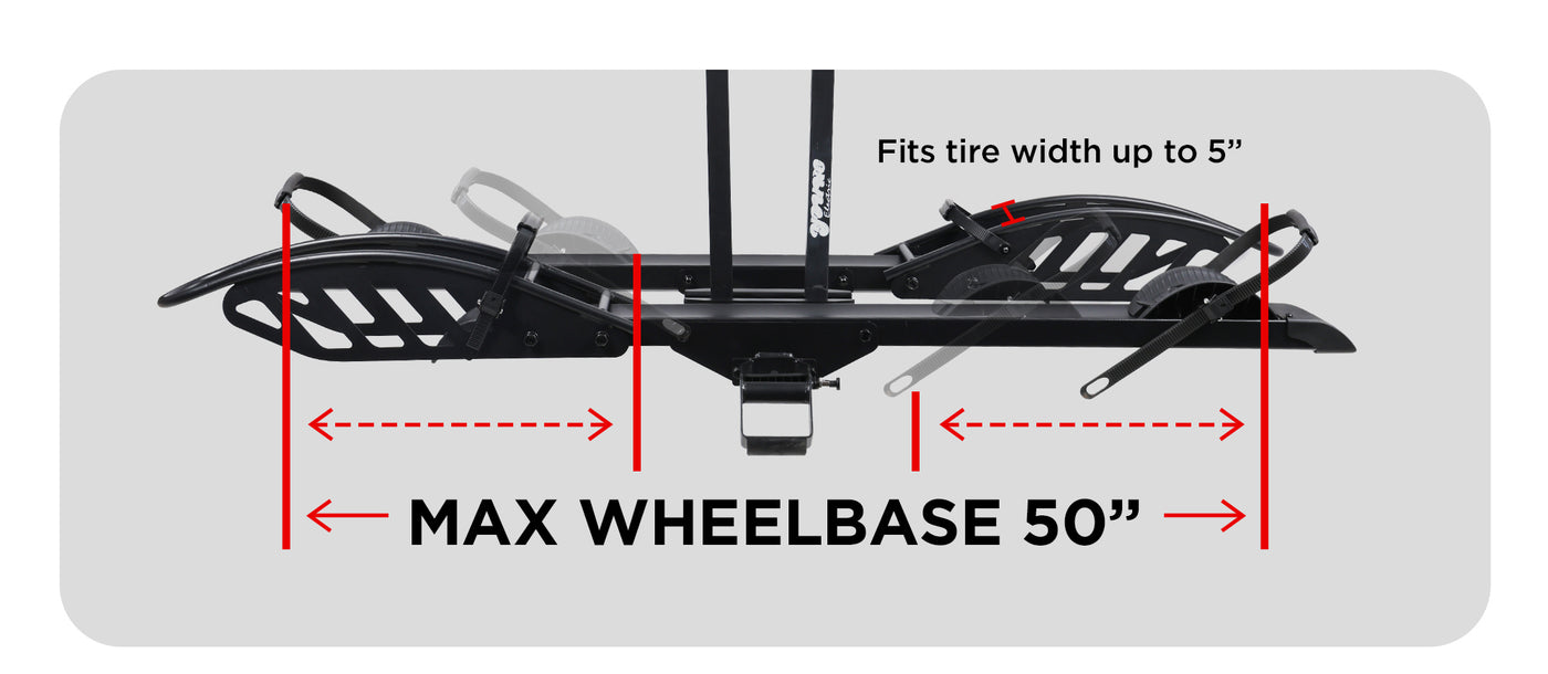 - 200 LB TOTAL CAPACITY: Capable of carrying up to 100 pounds per bike, with universal tire holders and wheel straps that can accommodate bikes with up to 5” fat tires and a maximum wheelbase of 50 inches.