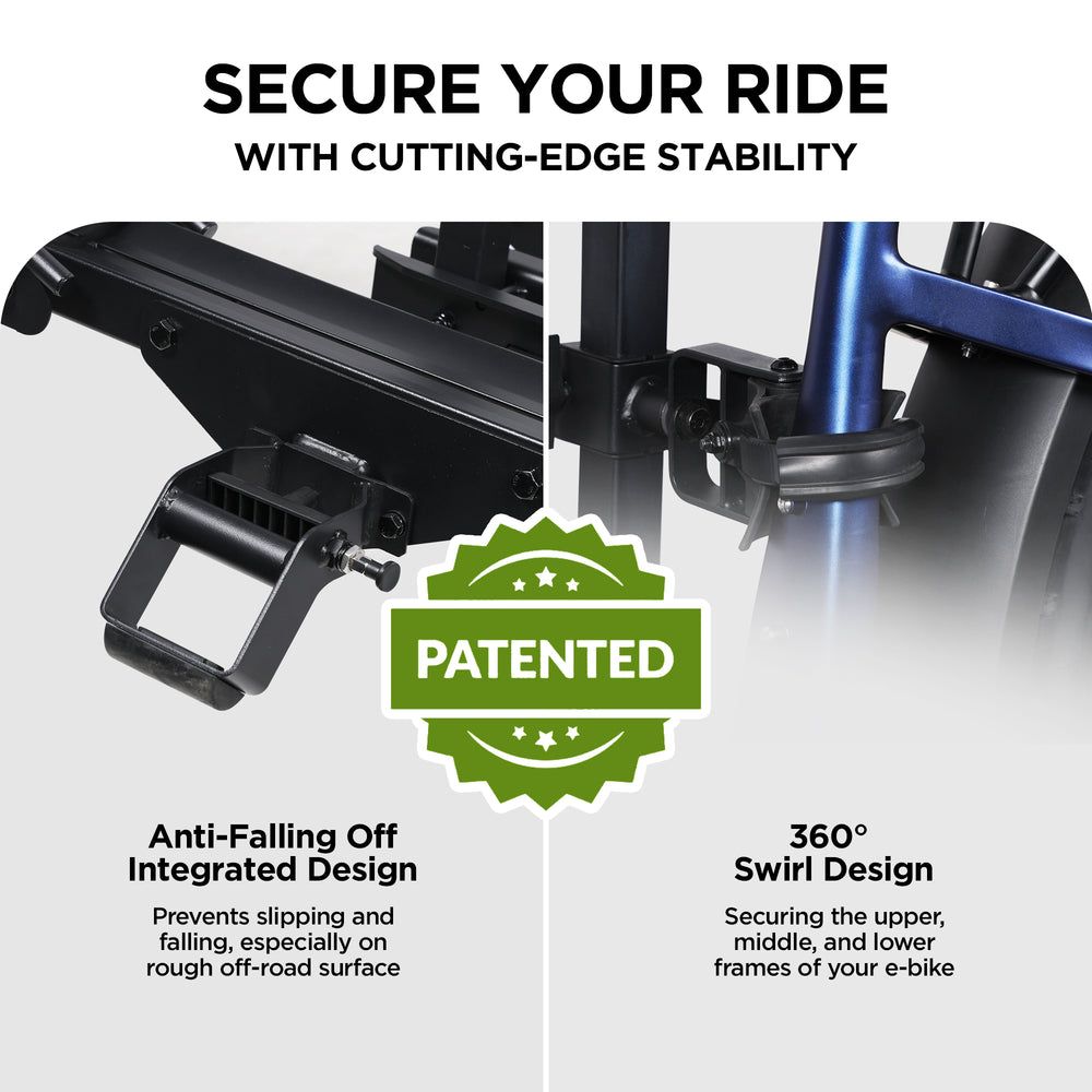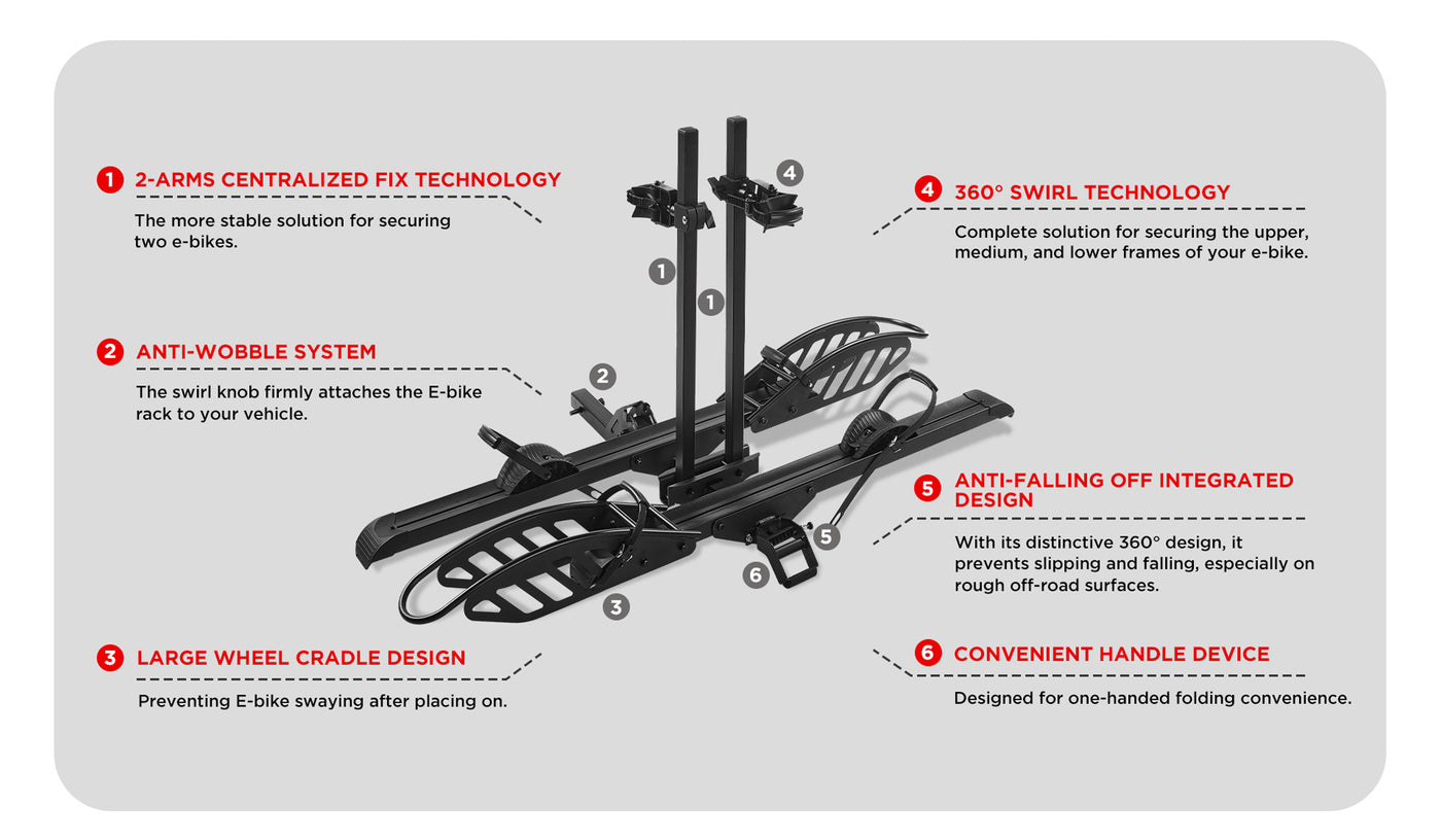 - SAFE AND SECURE: Equipped with a 2-arm fixing system, patented secure wheel cradles, an anti-wobble structure, and a 360° anti-falloff swirl design, this rack keeps your e-bikes firmly in place without swaying or bumping into your vehicle.