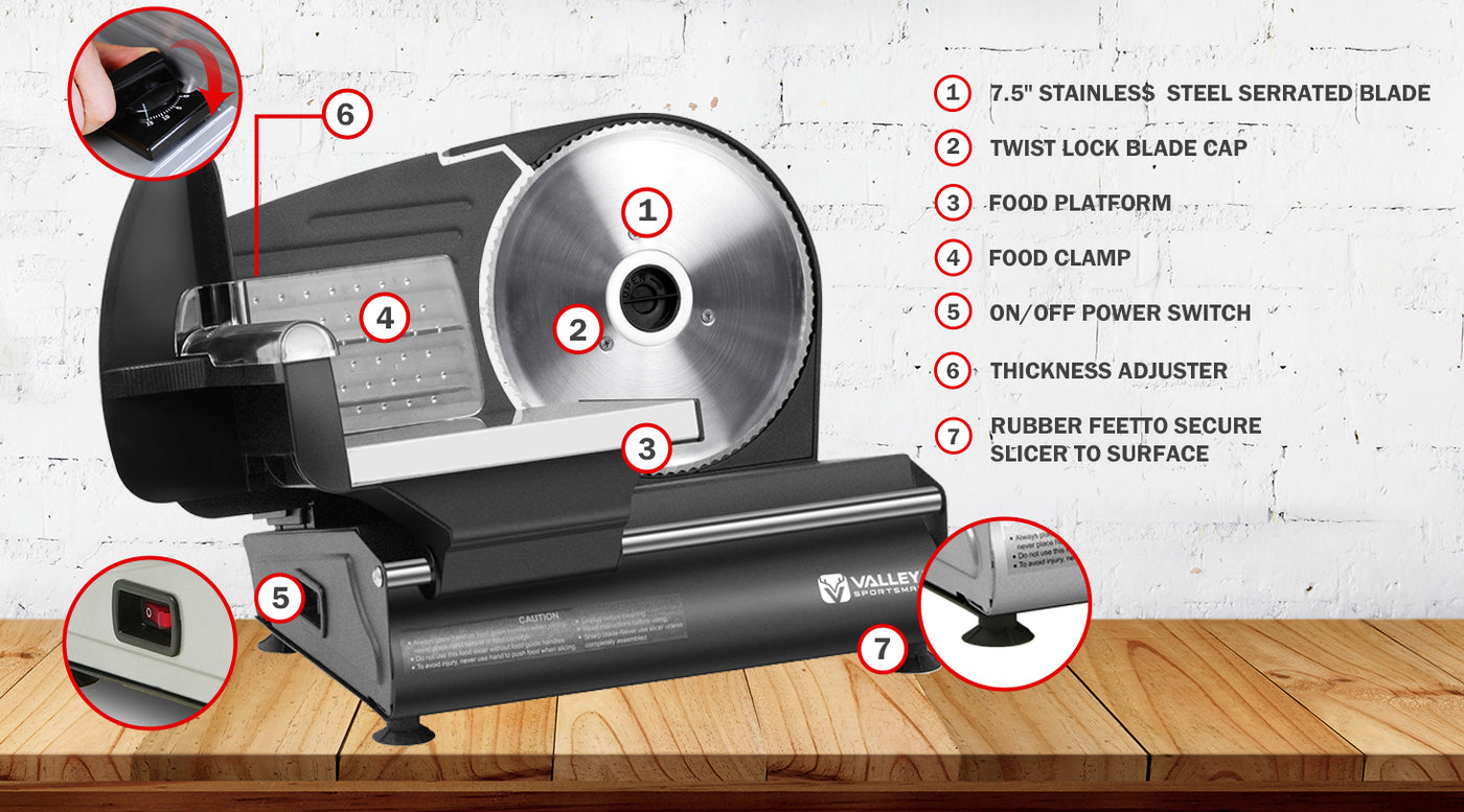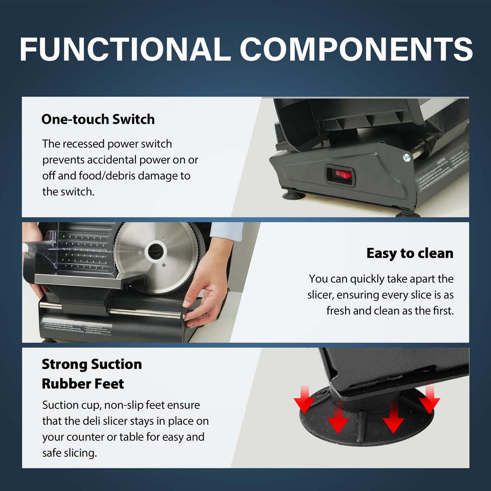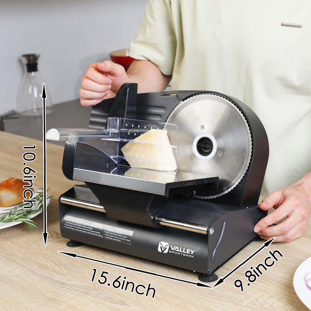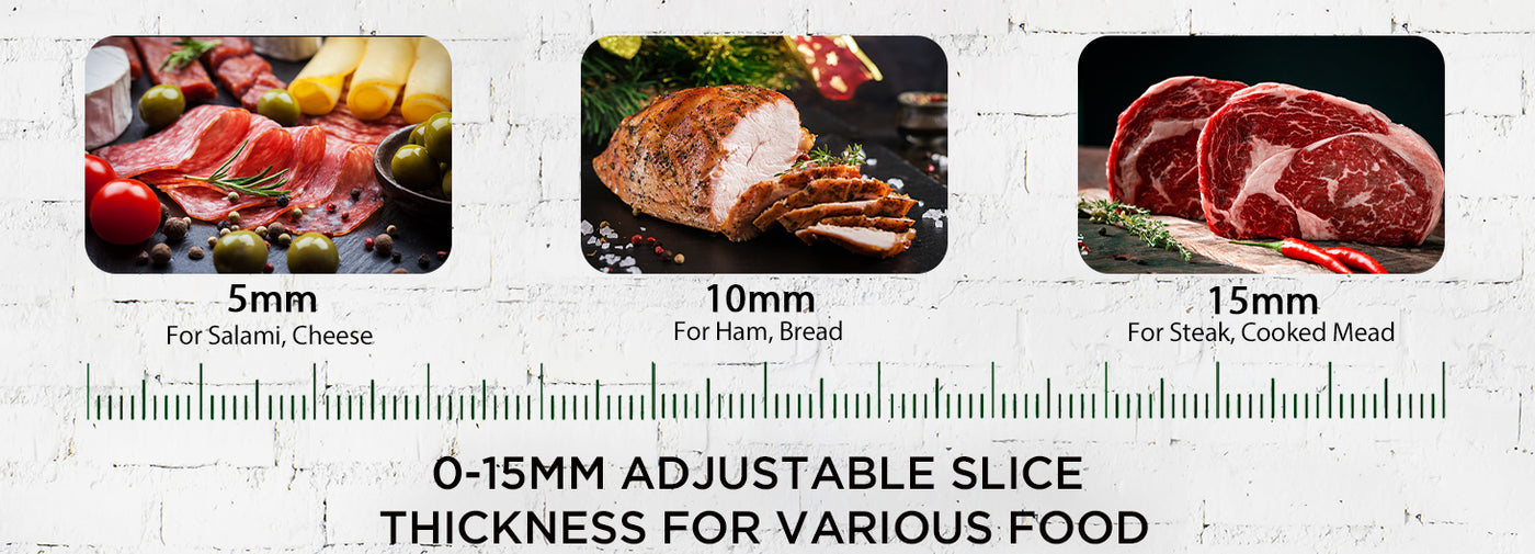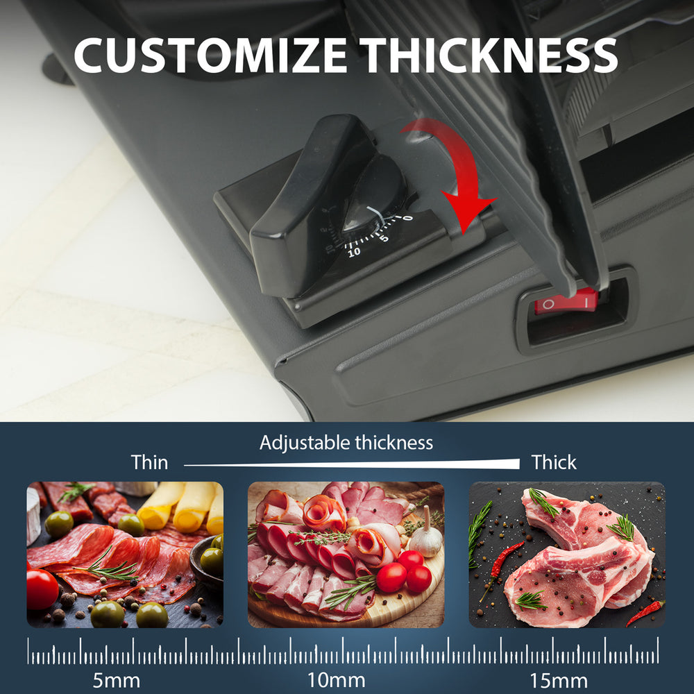 - Versatility: Adjust the slice thickness with a simple dial. The deli meat slicer not only slices lunch meat but can slice vegetables, hard cheeses, and fruits, too, making them more versatile.