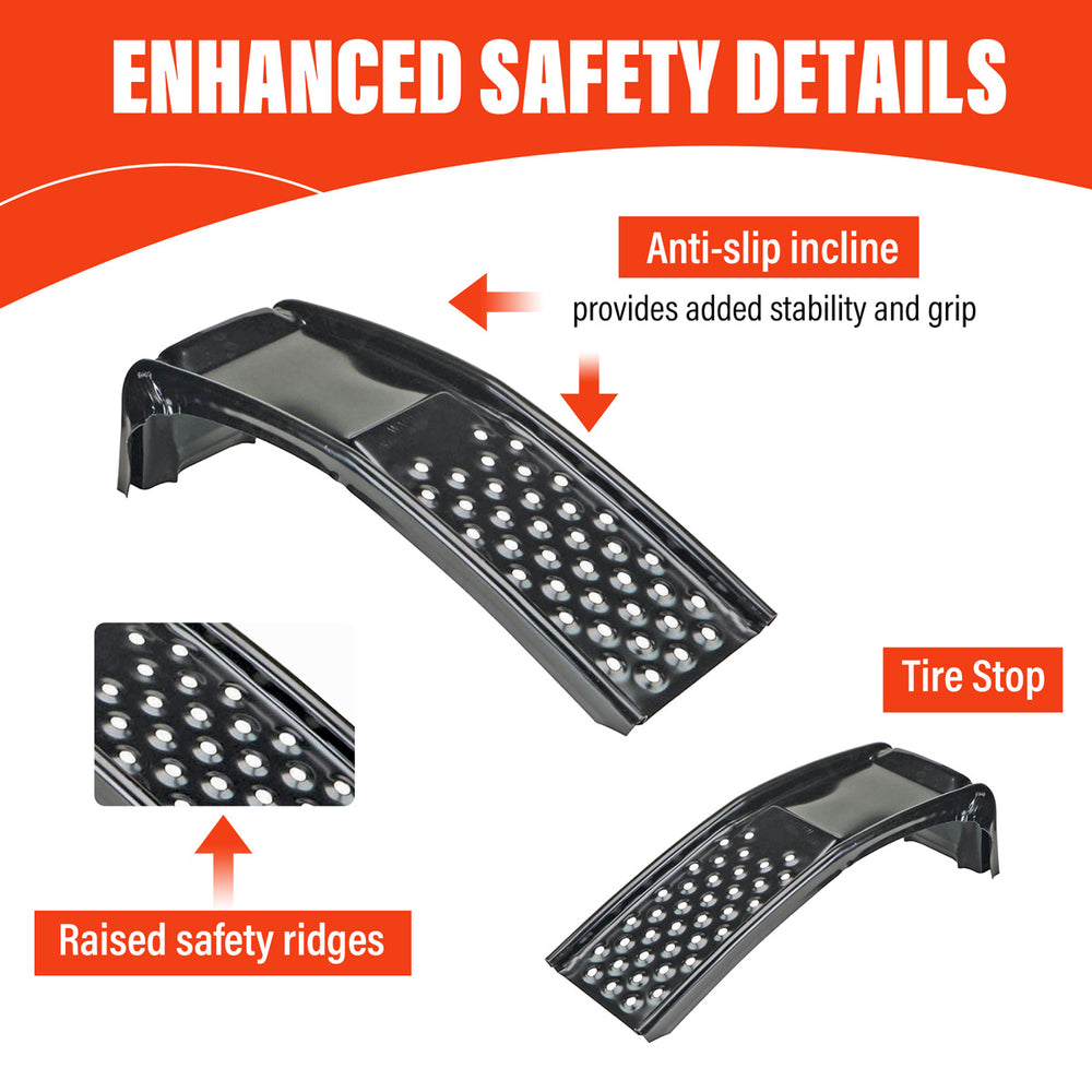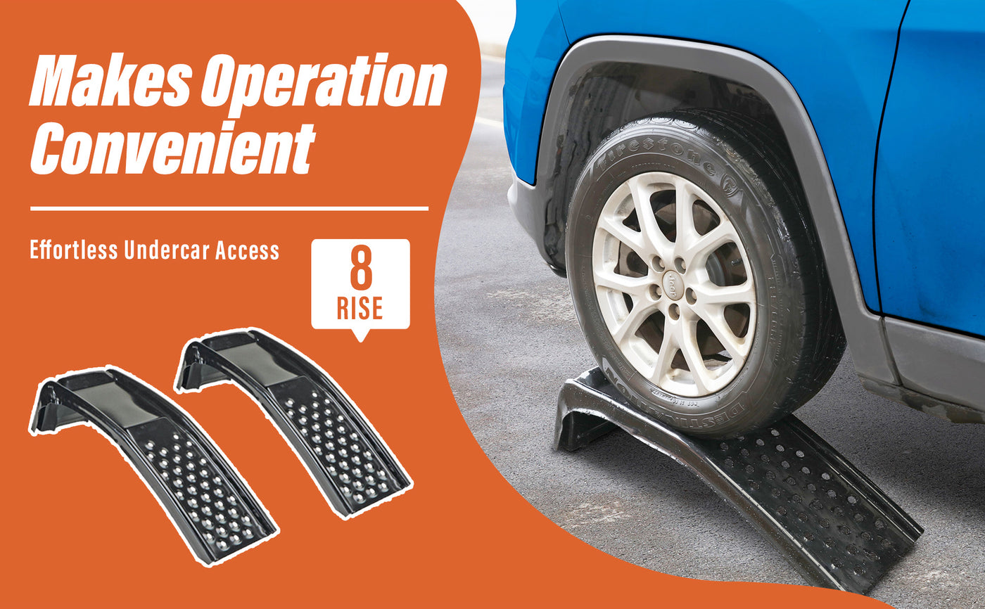 SAFETY FIRST: Featuring raised safety ribs on the sides and punched, extruded traction holes, these ramps provide excellent grip and stability, preventing your vehicle from slipping during use. The ramps accommodate a maximum tire width of 9 inches, fitting a wide range of vehicles.