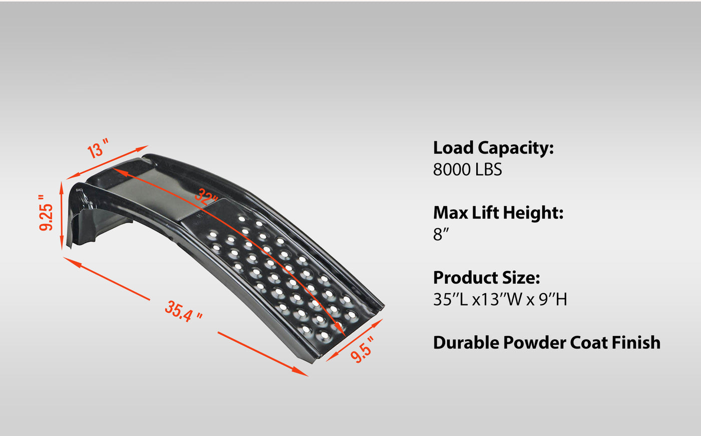 USER-FRIENDLY DESIGN: Quick and easy to set up, these ramps streamline your vehicle maintenance tasks. With compact dimensions of 35.5" L x 12" W x 9" H and a 9" max lift height, they provide a safe and practical way to access the undercarriage of your vehicle for various applications.